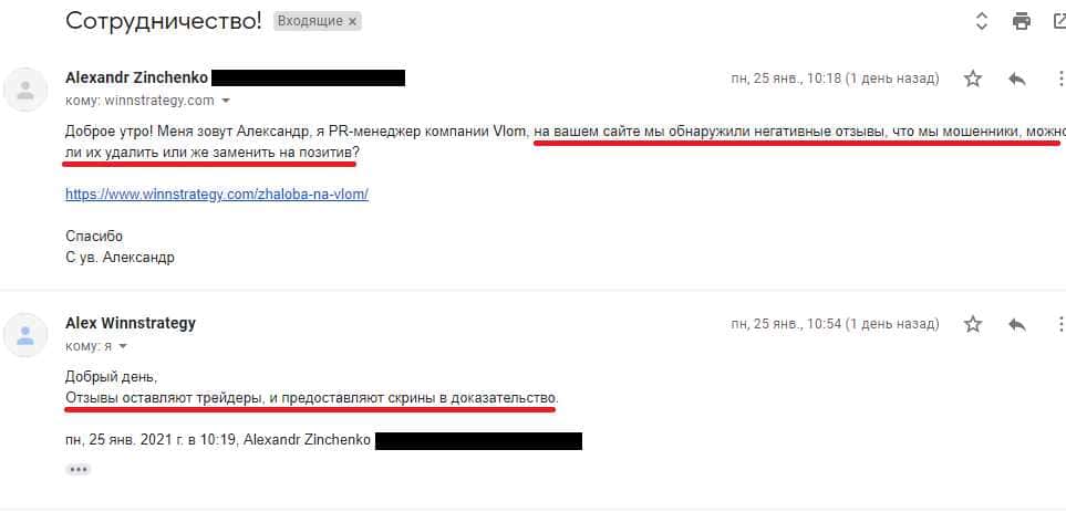 Ниже представлена переписка PR менеджера одного из лохотронов с фальшивым отзовиком WinnStrategy Com, в которой лохотрон просит удалить негативные отзывы о себе.