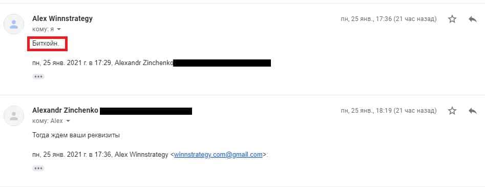 На данном скрине видно, как информационные жулики WinnStrategy Com предоставили менеджеру лохотрона реквизиты, и менеджер спросил когда сделать оплату.