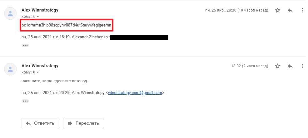 Далее обе стороны сошлись на том, что оплата будет производится в биткоинах. Аферисты попросили реквизиты отзовика для оплаты услуг по удалению отзывов.