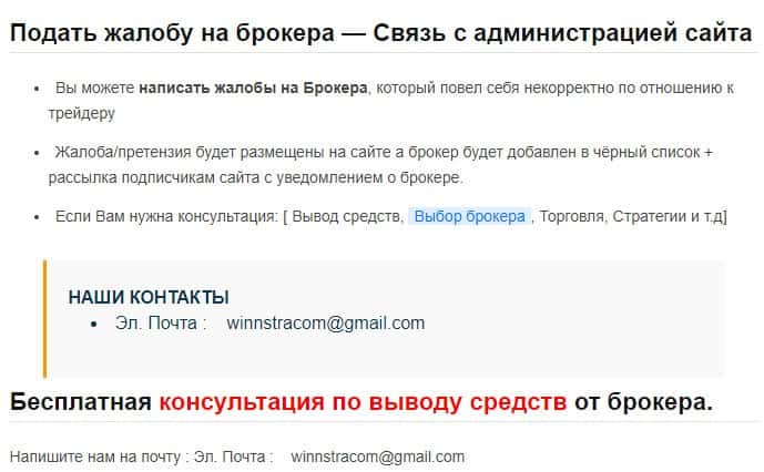 В разделе "Связь с администрацией сайта" мошенники из мошеннической структуры WinnStrategy Com указали лишь почту и предоставили бред, что там нужно подробно написать.
