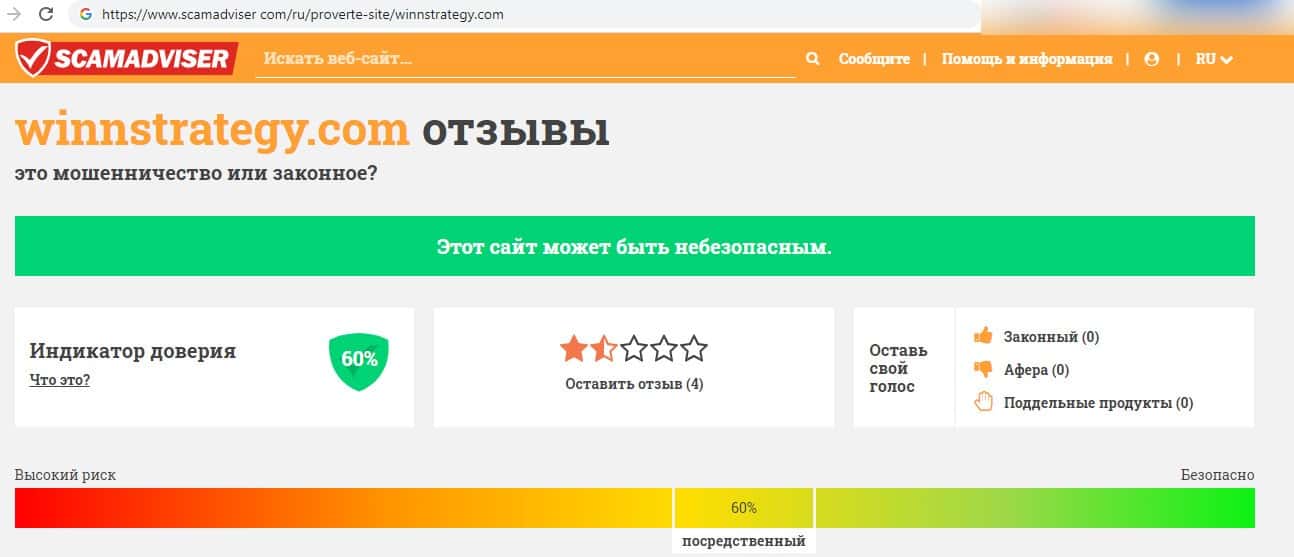 Махинаторский лоховод WinnStrategy Com, по мнению уважаемого ресурса scamadviser com имеет достаточно средний рейтинг доверия - 60 % что небезопасно. Лучше обходить жуликов.