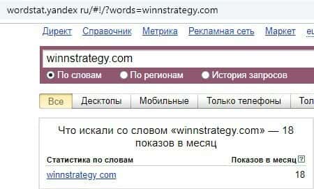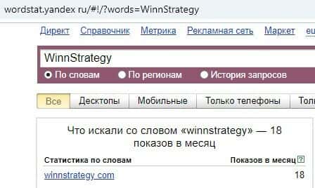 Количество запросов по доменному имени " Winn Strategy", вбиваемого с пробелом, совершенных в поисковом сервисе Яндекс, достигает всего лишь двух показов за весь месяц.