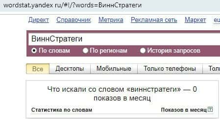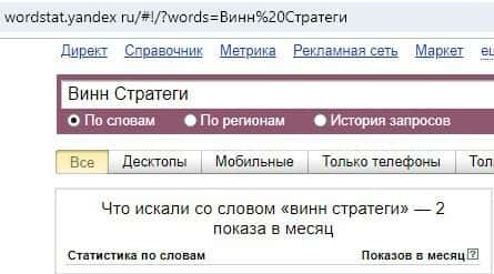 Ноль запросов в месяц в поисковике Yandex осуществляли по шарашкиной компании на русском языке, а конкретно - делали поиск без единого пробела "ВиннСтратеги".