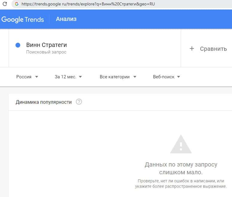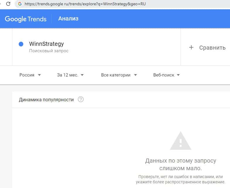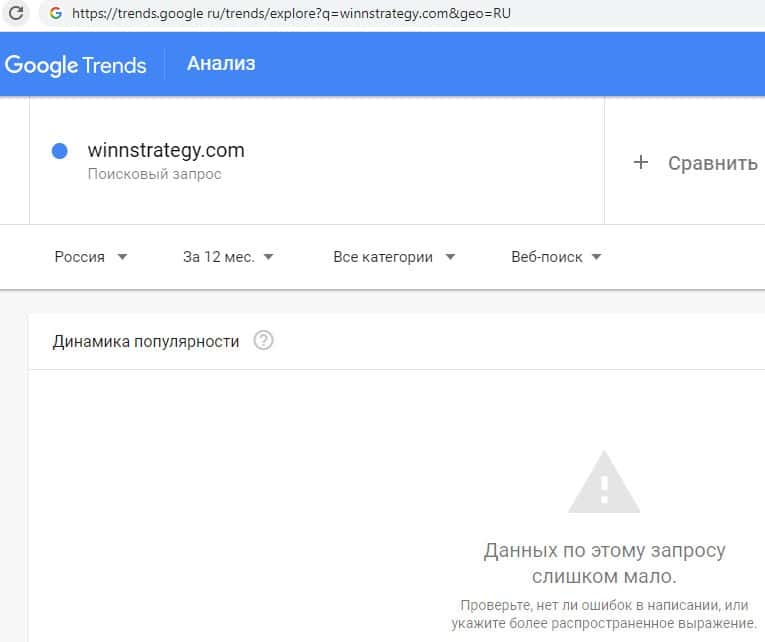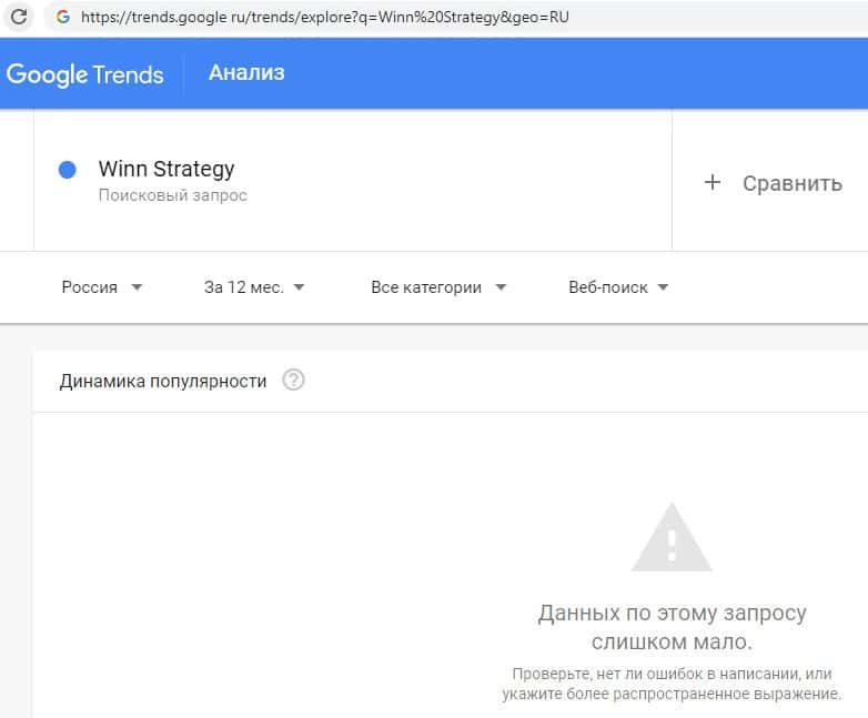 В поисковой системе Гугл Трендс бренд доменного имени с пробелом "Winn Strategy" также слишком не блещет популярностью, так как именно по такому запросу слишком мало данных.