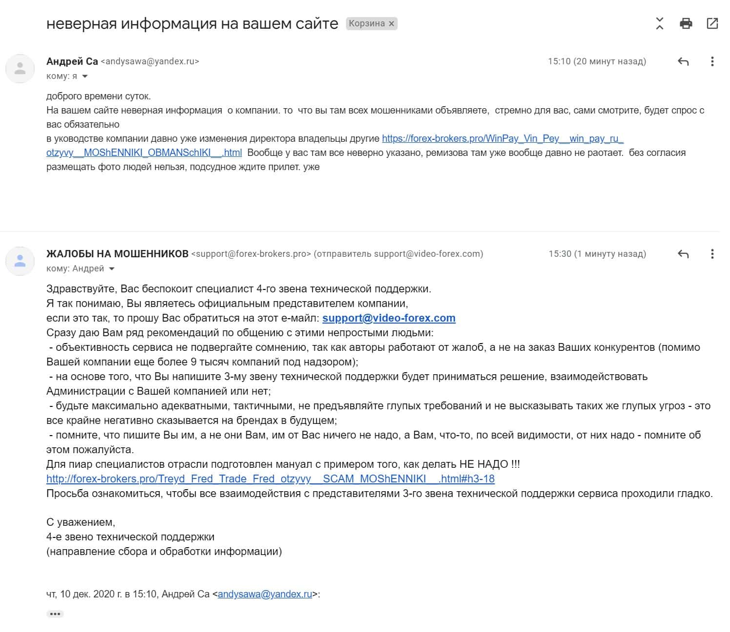 Очередные мошенники решили, что надо бы напугать судами за данную статью. На этот раз пишет какой-то Андрей Са с е-майла: [email protected] - довольно отчаянные ребята, надо сказать. Пишут, что руководство у Вин Пей уже другое, что судов ждать - ну ладно, понятно. Только настораживает в этом всем то, что мошенники Вин Пей тесно связаны с другим лохотроном - Каури, которые владеют мошенническим обменником Сейф Карренси, и по непроверенным данным, Вин Пей является подконтрольной компанией мошенников Каури. И надо заметить, что разделение активов на легальны и нелегальный бизнес - это хорошая затея, но не всегда это работает так как хочется. Сам текст жалобы публикуем ниже.