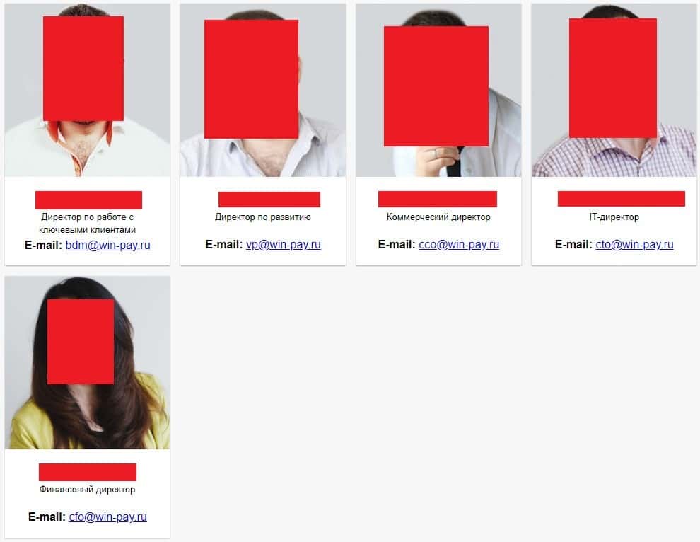 А вот руководство, контора Вин Пэй не побоялась выставить на показ и даже прикрутила фотографии и электронные почты для связи с ними. Таким образом можно отметить следующее - лохотрон находится под крышей государственных чиновников, поэтому и не боятся никакой ответственности. И все же стоит ознакомиться с ними: