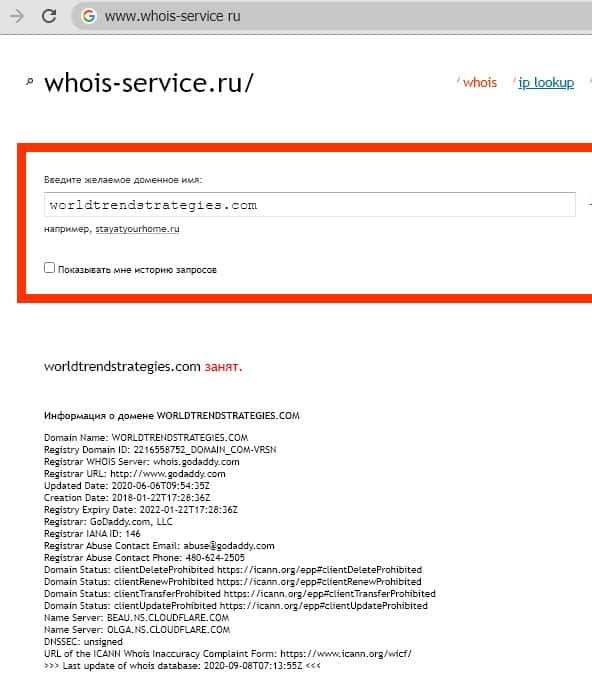 Результат аналогичный предыдущему запросу показывает и запрос сайта мошенников World Trend Strategies с точкой "worldtrendstrategies.com"