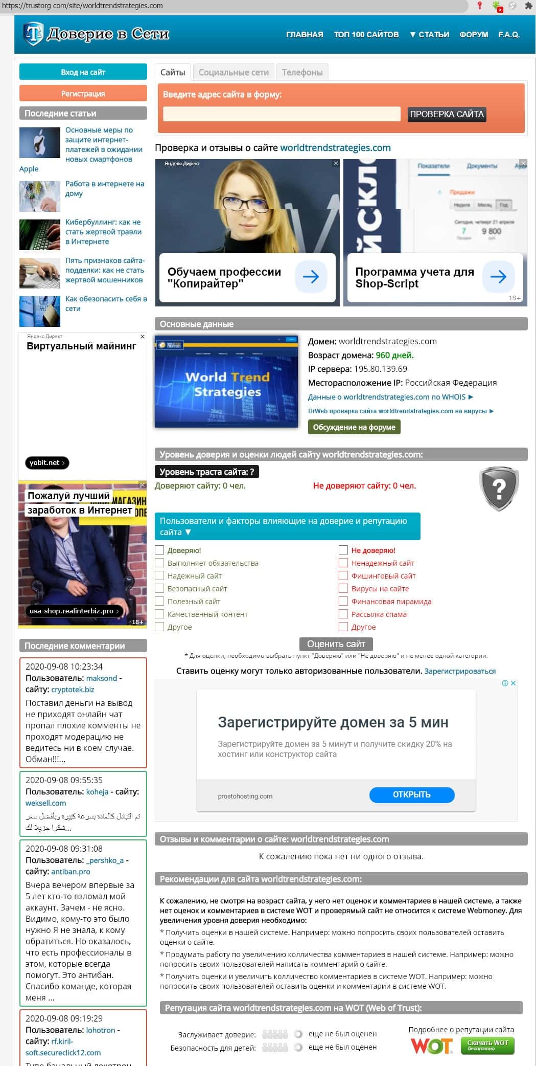 - Оценка домена мошенников из World Trend Strategies на портале trustorg com - "Доверие в сети"