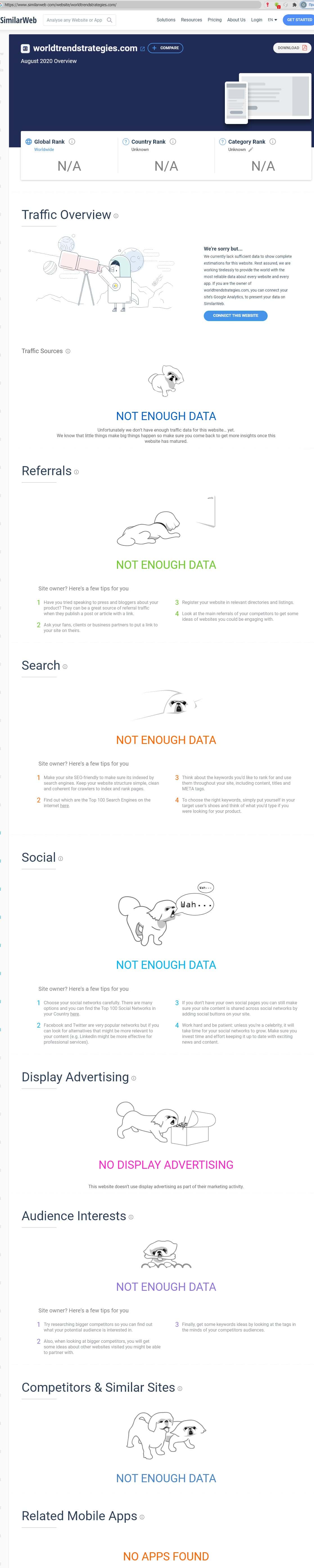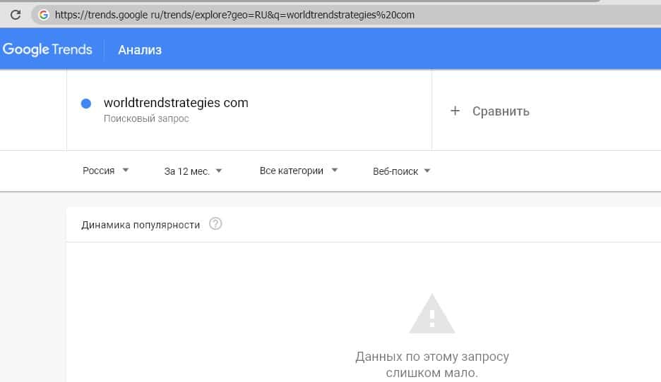Поиск самого сайта мошенников "worldtrendstrategies com" также не набирает необходимый минимум, хоть с точкой, хоть без.