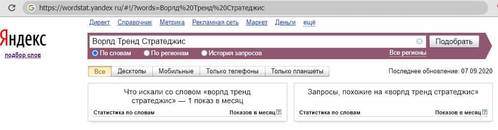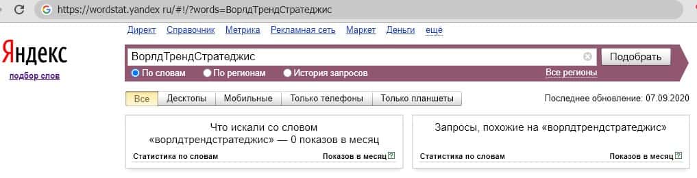 Даже английское название, хоть с пробелами, хоть без никто не ищет. Перед нами результаты показателей запроса "WorldTrendStrategies".