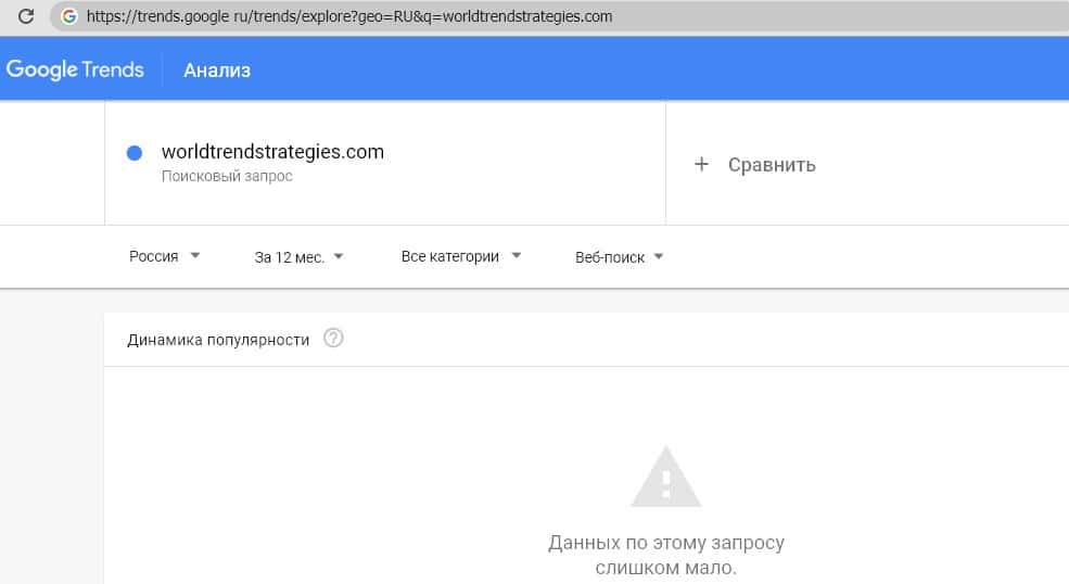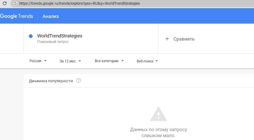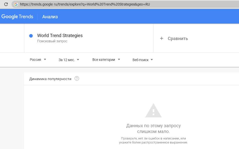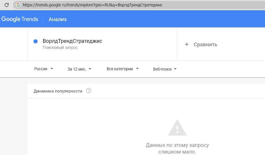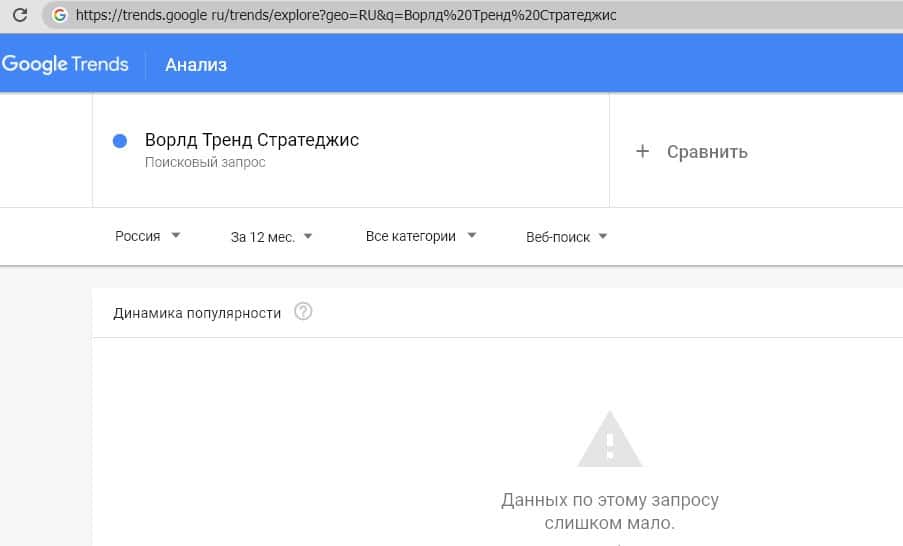 Русский вариант произношения названия компании (запрос "Ворлд Тренд Стратеджис") также не набирает достаточное количество запросов для оценки в Google Trends.