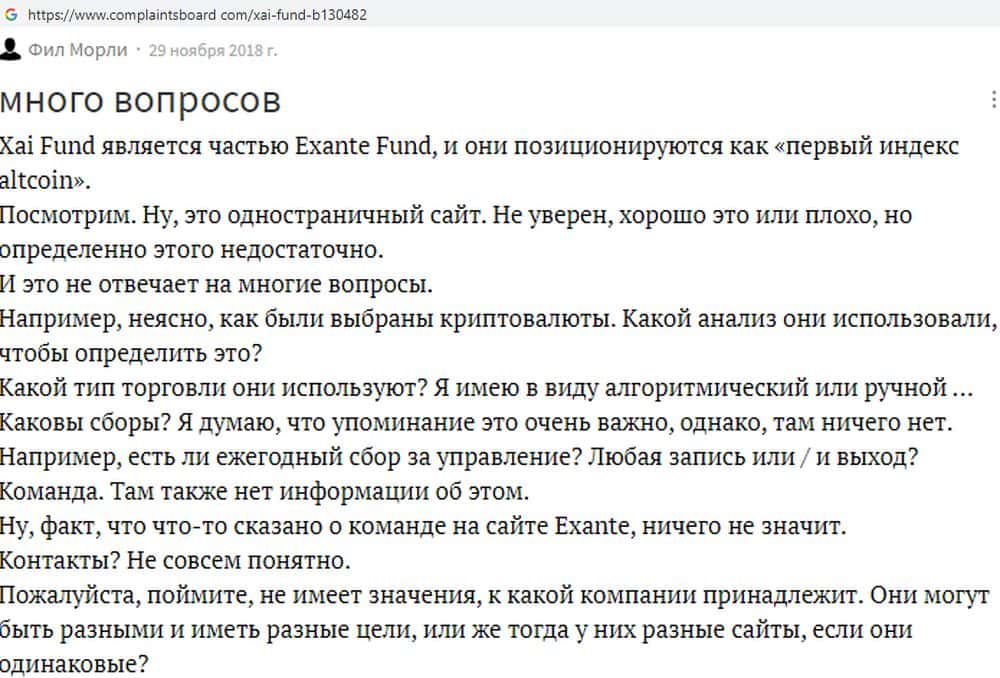 XAI Fund, один из новых скам-проектов группы аферистов ЭКЗАНТЕ, не вызывает у трейдеров доверия. На портале complaintsboard com они отмечают, что проект с доходностью якобы в 40% расположился на кривом недо-сайте, где нет существенной и важной для трейдера информации и даже нормальных контактов, одни пустые обещания.