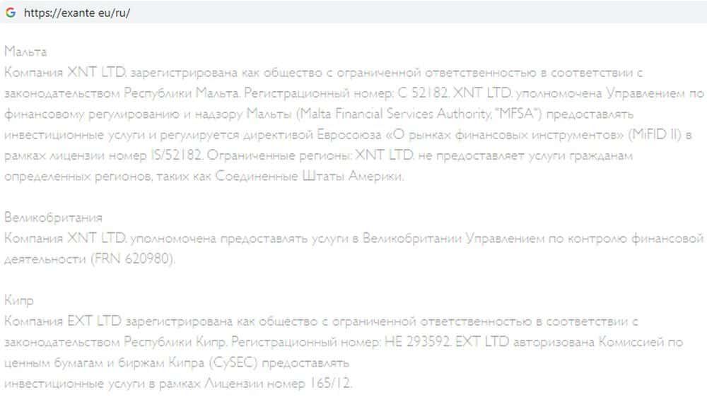 Зато такая регистрация есть у аферы ЭКЗАНТЕ, матки жуликов XAI Fund. У нее вообще несколько регистраций, две из которых оффшорные, а третья якобы Европейская. Правда, по данным регулятора Великобритании, лицензия EXANTE ограничена. Так что, если жулики Хай Фонд говорят о Мальте, они имеют в виду лицензию EXANTE под номером IS/52182.