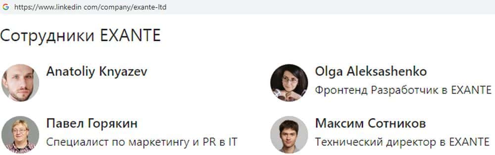 Понятно, что афера XAI Fund находится под мошенническим управлением конторы EXANTE. Об этом говорит и ссылка на портал linkedin com, которая есть на их сайте. Там указан профиль руководителя и есть несколько имен ведущих сотрудников, но вряд ли эти люди имеют отношения к реальному управлению аферой. Руководство лохотрона: