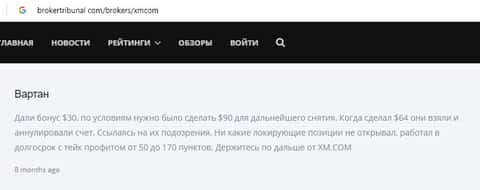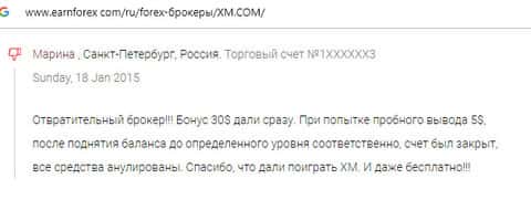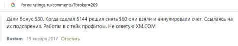 Далее представлен отзыв о том, как клиент захотел получить бонус от конторы XM Com в размере 30 долларов, чтобы нормально стартонуть в сфере трейдинга. Ему удалось заработать около 150 долларов, 60 долларов из которых он решил вывести. После этой операции счет был полностью аннулирован.