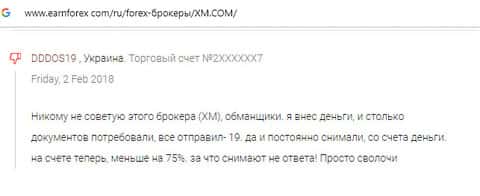 Очередной пострадавший не рекомендует связываться с лохотроном ХМ Ком, так как мошенники обнесли его торговый счет на 75%. Он внес деньги, прошел верификацию и его не предупреждали, что каждый день будет сниматься комиссия за обслуживание счета. Но зайдя через время на свой аккаунт, понял, что его обворовали.