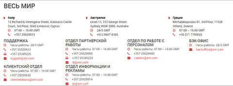Для связи с мошенниками XM Com, контора предусмотрела огромное количество почт и телефонов, так как лохотрон считается международным. Это все имидж, который создала себе эта шарага. На самом деле это обычный оффшорный брокер, который ворует деньги у наивных клиентов. Для вашего уведомления, оставим все контакты XM Com ниже: