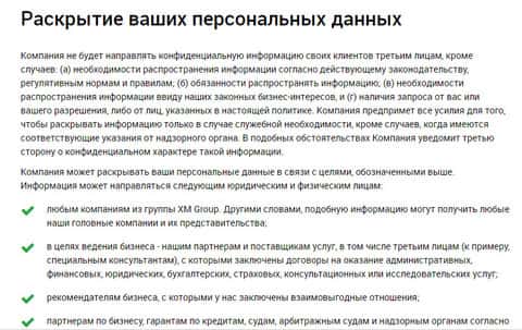 Как вариант следует еще рассмотреть политику конфиденциальности и понять, насколько безопасно передавать личные данные шарлатанам XM Com. Там сказано, что контора может раскрыть и передать информацию о вас третьим лицам по ряду причин, а их не мало. Когда данные уйдут за границу конторы ХМ Ком, там уже они отвечать не будут.