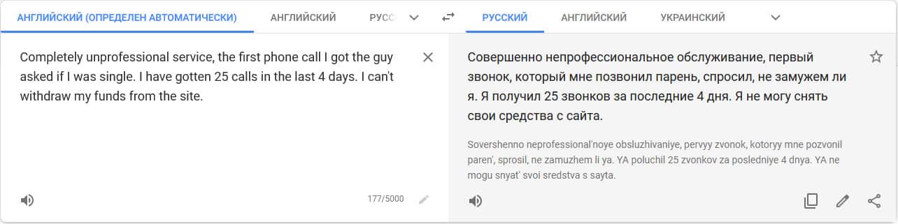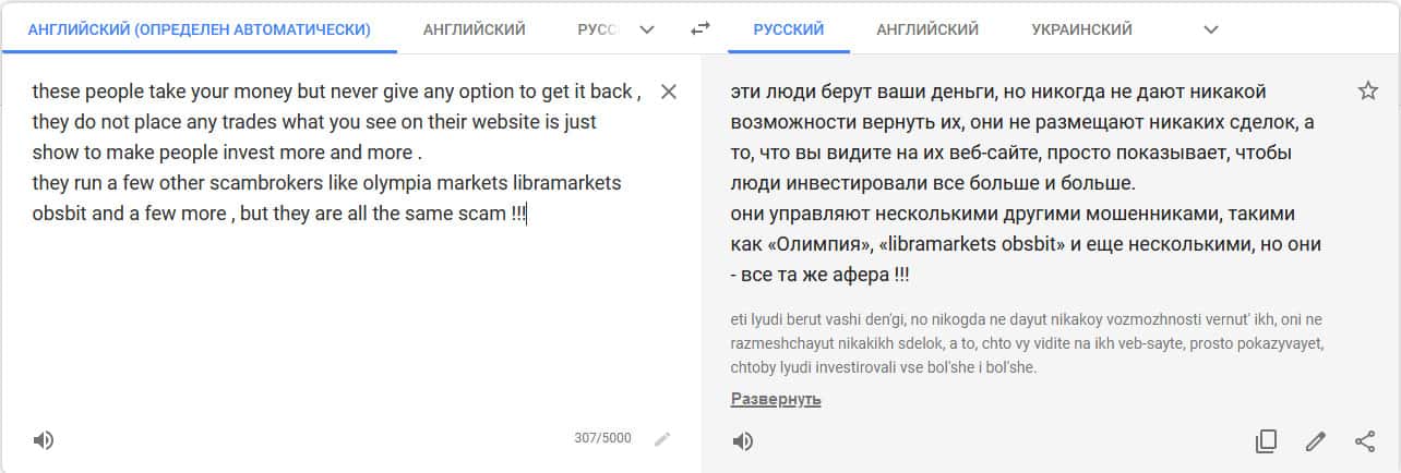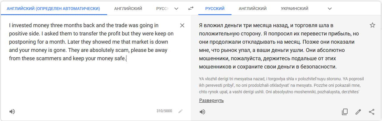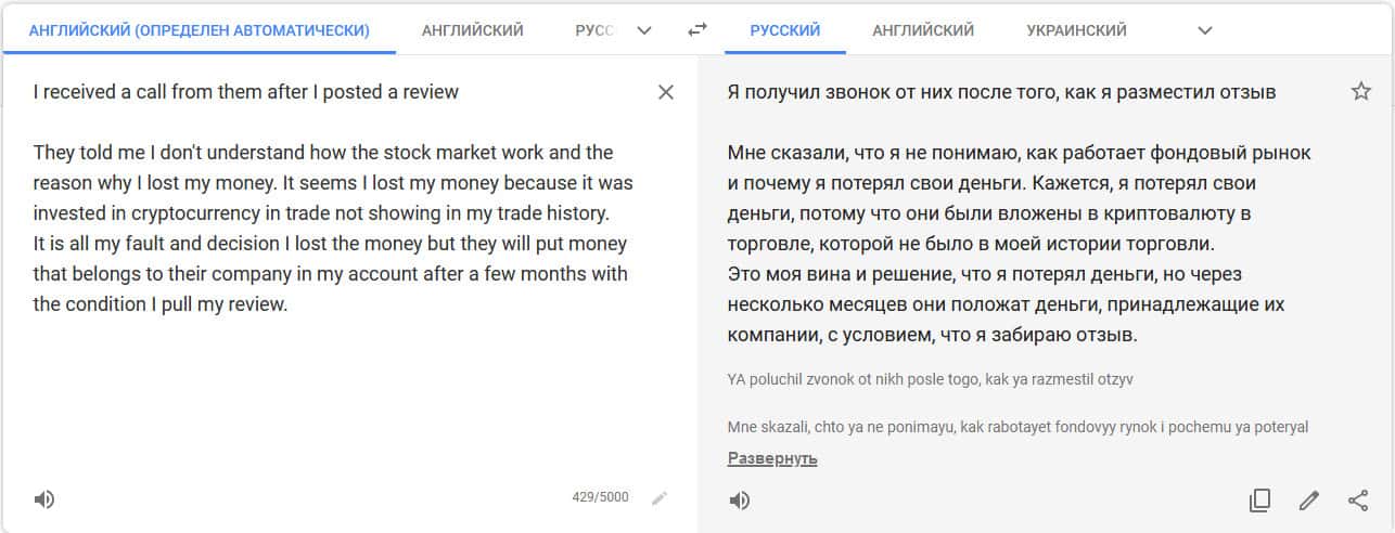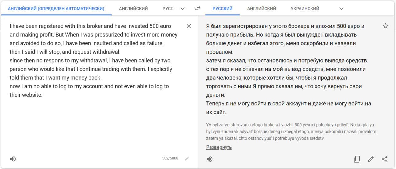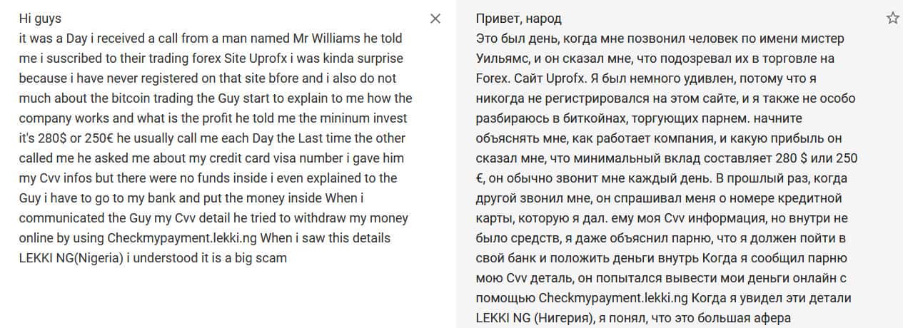 Перевод отзыва о UProFx на сайте translate.google comЮ Про ФХ пытались внаглую снять деньги с карты клиента