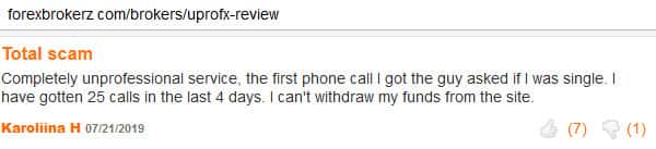 Обслуживание и сервис UProFx также оставляли желать лучшего. Они задавали клиентам много лишних вопросов и при этом еще похищали их деньги. Чем то в этом смысле они напоминают коллекторов, которые также терроризируют людей по телефону. Жулики были одним словом, что сказать.