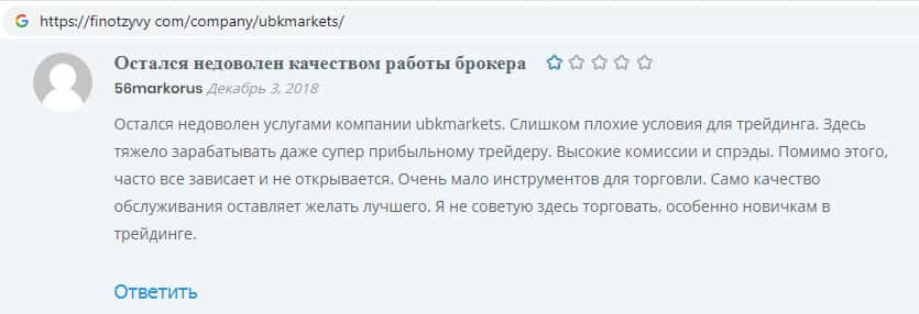 Некий 56markorus остался недоволен услугами компании ubkmarkets. В своем отзыве на интернет портале finotzyvy com пользователь пишет о неудобстве трейдинга, высоких комиссиях и о плохом качестве обслуживания.