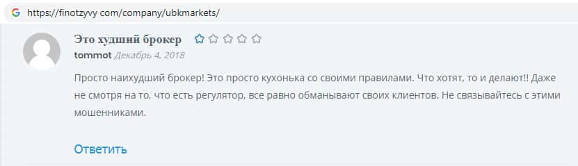 Некий tommot оставил свой отзыв о скам-брокере ЮБК Маркетс на сайте finotzyvy com о том, что это наихудший брокер и всего лишь навсего очередная форекс-кухня с целью предупредить о мошенничестве организации.