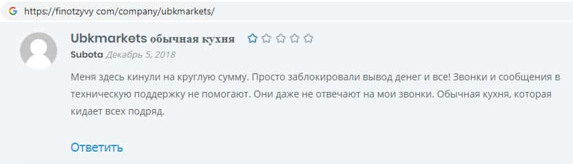 На сайте finotzyvy com так же найден очередной отзыв о том, что мошенники ЮБК Маркетс заблокировали вывод средств и кинули на круглую сумму, автором отзыва является некая Subota.