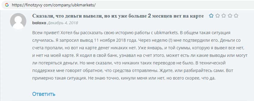 Так же оставил отзыв на сайте finotzyvy com некий balaxa о том, как мошенники ЮБК Маркетс пообещали вывести на карту денежные средства, в итоге он остался без ничего. Деньги со счета пропали и не перевелись на карту.