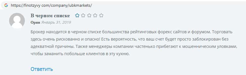 Некий Орин на сайте finotzyvy com пишет о том, что брокер ЮБК Маркетс находится в черном списке большинства рейтинговых форекс сайтов и форумов. Есть вероятность, что ваш счет будет заблокирован без всякой причины.