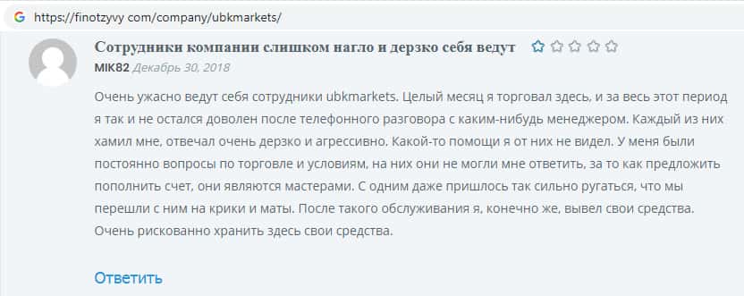 Некий MIK82 на интернет портале finotzyvy com пишет о резком и агрессивном поведении сотрудников ЮБК Маркетс. На его вопросы о торговле и условиям сотрудники отказывались отвечать. Но некому MIK82 повезло в том, что он вовремя смог вывести свои денежные средства.