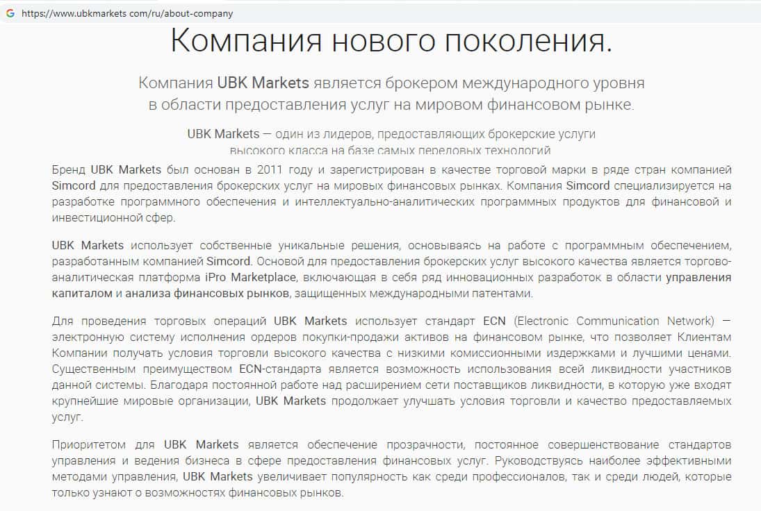 Мошенническая организация ЮБК Маркетс позиционирует себя как компанию нового поколения, как одну из лидеров предоставляющих брокерские услуги. Не верьте словам мошенников, потому как красивые слова о компании на самом деле ничего не значат.
