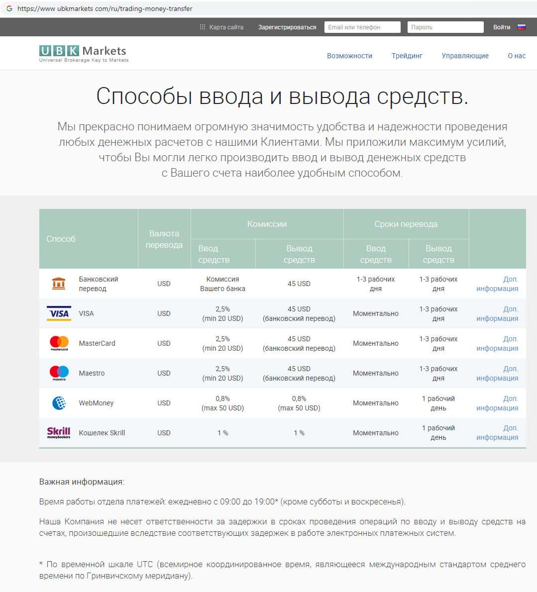 На сайте жуликов ЮБК Маркетс для ввода и вывода средств предлагается список международных платежных систем. Если вовремя не перевелись средства с торгового счета клиента на банковскую карту, мошенники ЮБК Маркетс списывают это на возможную задержку в сроках проведения операций или задержку в работе электронных платежных систем.