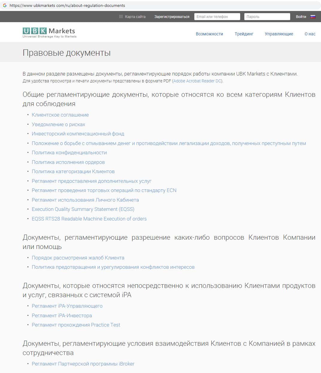 На сайте скам-компании ЮБК Маркетс имеется полный список правовых документов, включая клиентское соглашение, уведомление о рисках, положение о борьбе с отмыванием денег, а так же о политике конфиденциальности. Рекомендуем Вам, прежде чем с кем-либо связываться, прочитать и изучить внимательно все документы, в которых может быть подвох.
