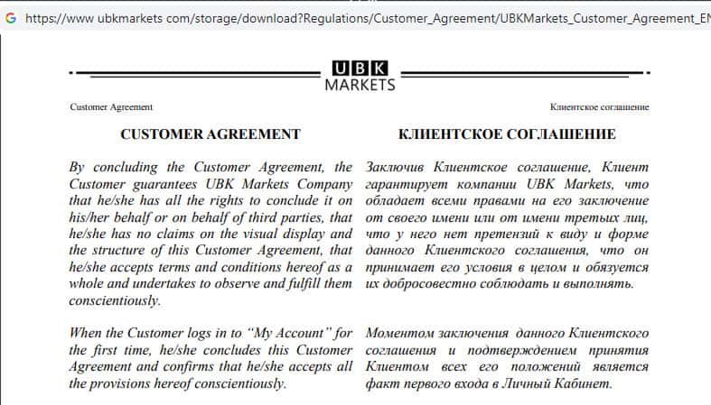 На официальном сайте брокера ЮБК Маркетс предоставлен документ о клиентском соглашении. Клиент, подписывая данный документ автоматически соглашается со всеми предлагаемыми ему условиями и предложениями. Прежде чем подписывать клиентское соглашение компании ЮБК Маркетс, внимательно изучите документ.