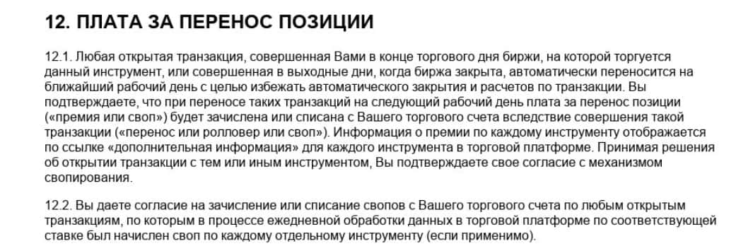В пункте договора 12 брокер говорит пользователям, что взимает плату за перенос позиций на следующий день. Пользователь должен дать свое согласие на это.