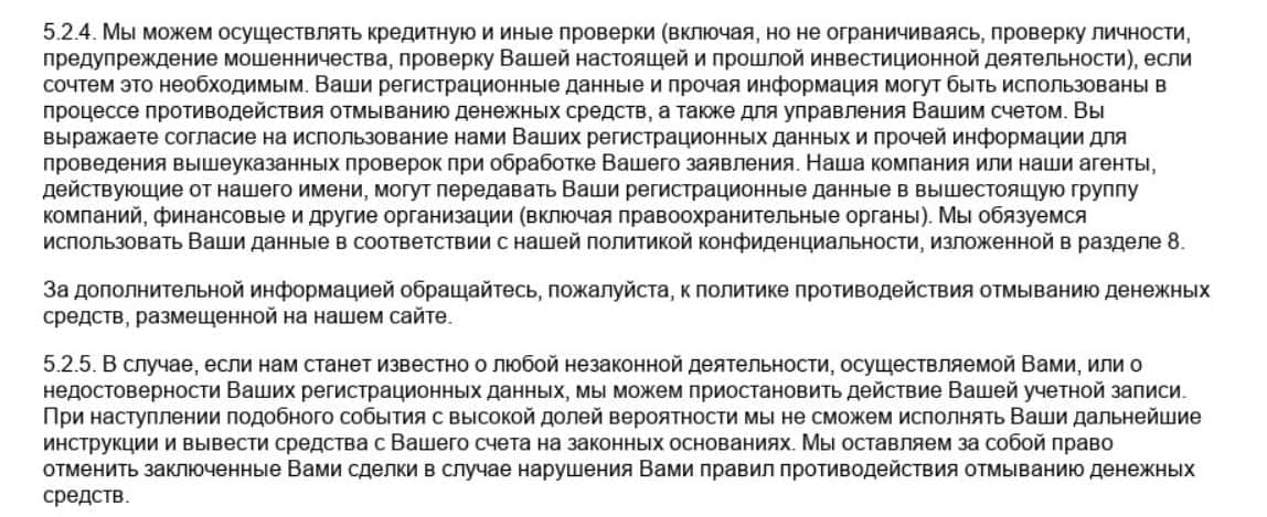 В пунктах 5.2.4-5.2.5 компания ЮИ Групп уведомляет, что может заблокировать счет клиента, если ей станет известно о незаконной деятельности пользователя.