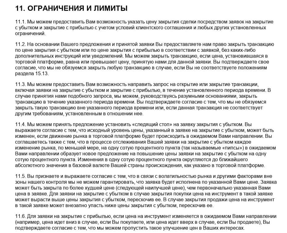 В разделе Ограничения и лимиты компания ставит в известность клиентов, в каких случаях он может закрывать сделки трейдера с убытком или с прибылью.