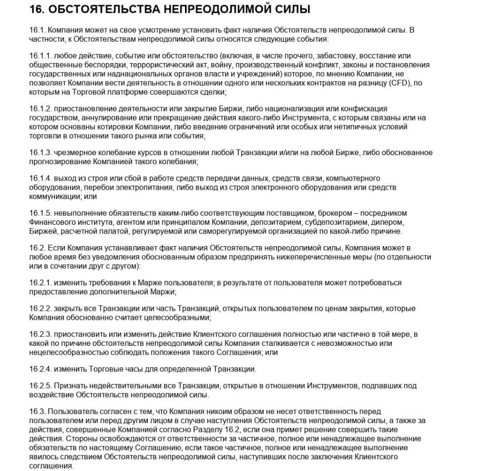 В разделе 16 компания ЮИ Групп пишет, что может на свое усмотрение устанавливать обстоятельства непреодолимой силы. Далее она описывает, что к ним относится.