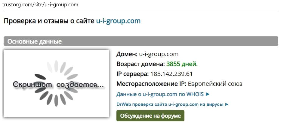 Возраст доменного имени сайта U-I-Group com составляет 3855 дней. Домен был куплен у сторонней компании, чтобы создать видимость длительной работы брокера.