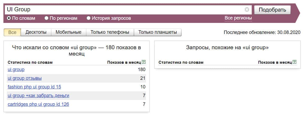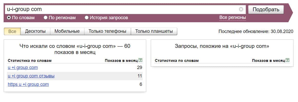 То же название "UI Group", но написанное с пробелом, пользователи пытались найти в системе Яндекс 180 раз.