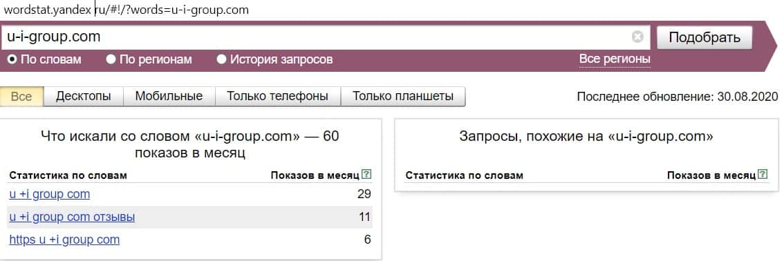 Количество запросов в поисковике Яндекс по доменному имени "u-i-group com" без точки, не отличается от предыдущего. Результат: 60 показов.