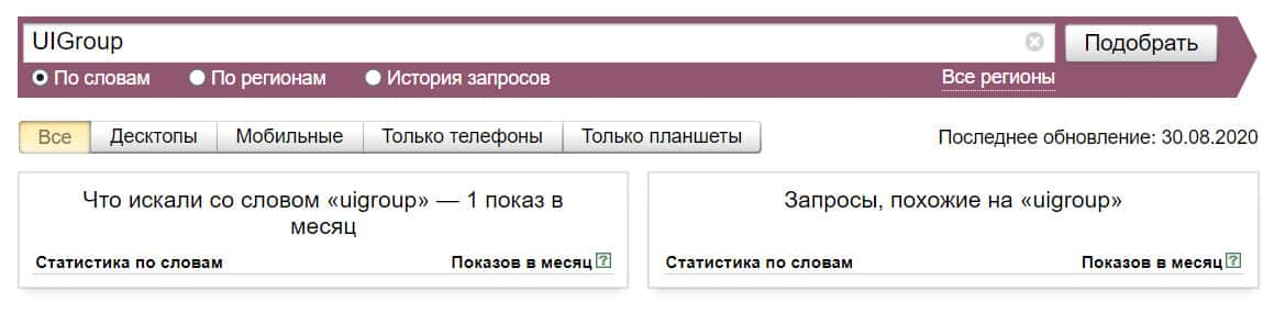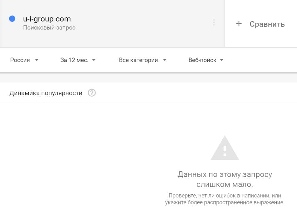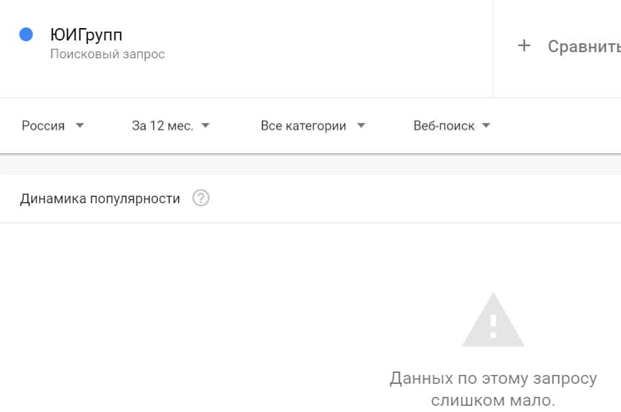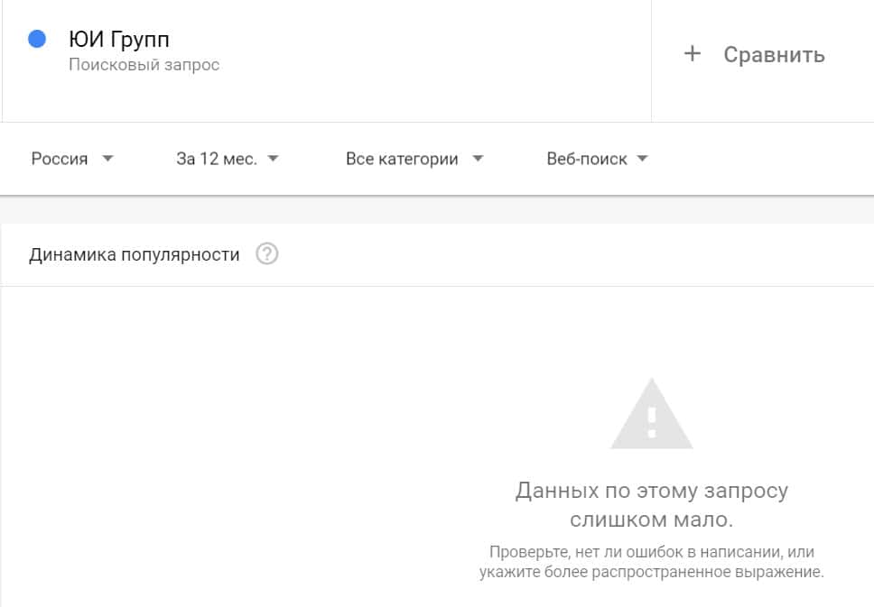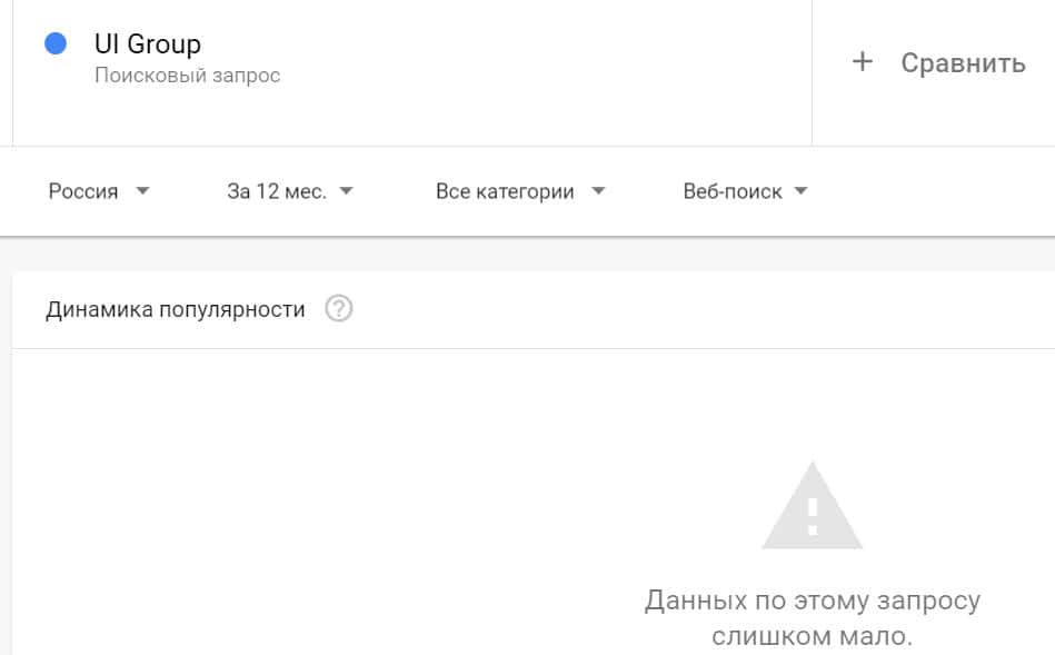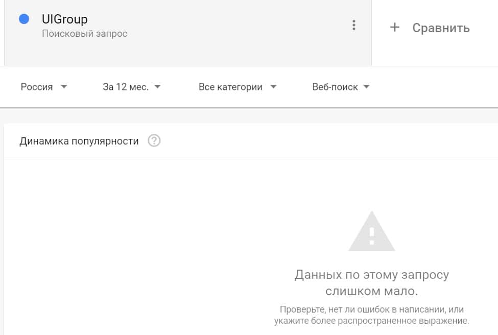 Посмотрим, насколько популярно название бренда "UIGroup", написанное на английском языке. Данных по этому запросу нет, так как никто не искал этот бренд в Гугл.
