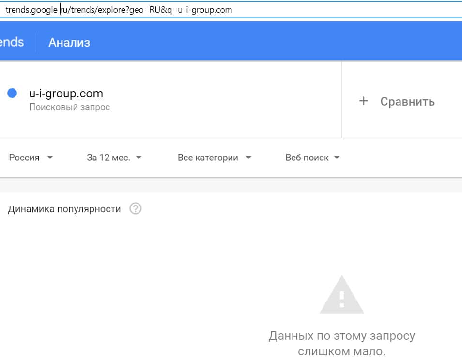 Количество запросов по домену "u-i-group com", вбитого в поисковик Гугл без точки, с пробелом, также происходило крайне мало раз.