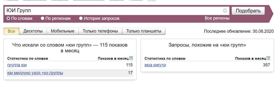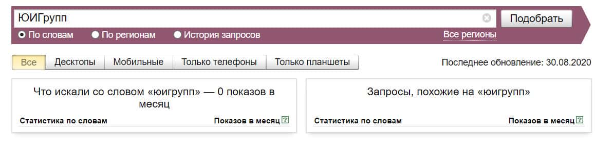 Посмотрим, сколько раз люди искали название бренда "ЮИ Групп" на русском языке с пробелом: результат 115 показов.