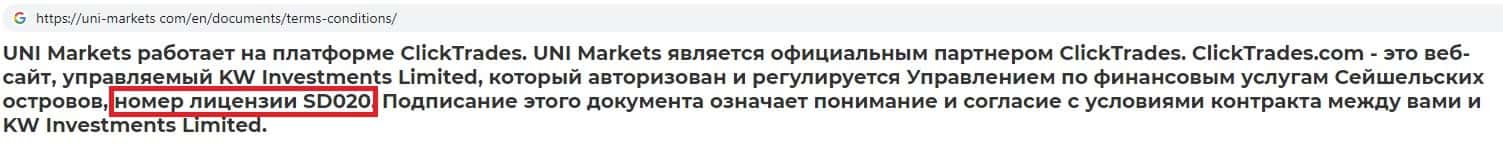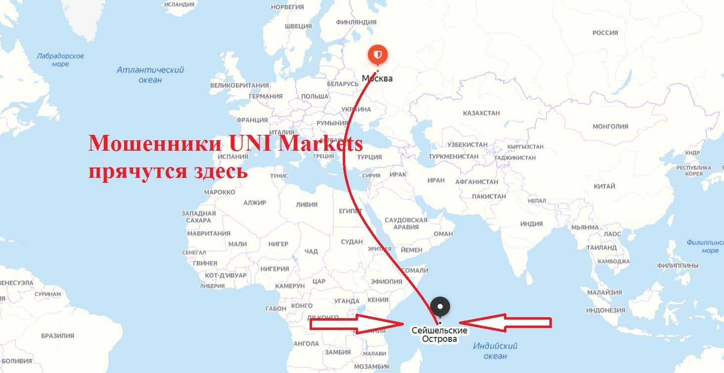 Жулики UNI Markets также указывают информацию об оффшорном месте регистрации компании на Сейшельских островах, не указывая конкретного адреса.