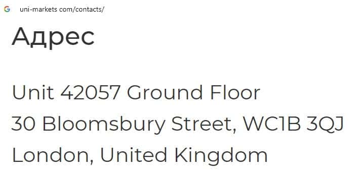 Шулера ЮНИ Маркетс указали адрес местонахождения главного офиса своей компании, который наверняка липовый: