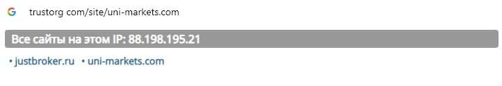 Мошенническая контора ЮНИ Маркетс находиться на одном IP-адресе с шарагой Just Broker, пользователи глобальной сети-интернет которой не доверяют.