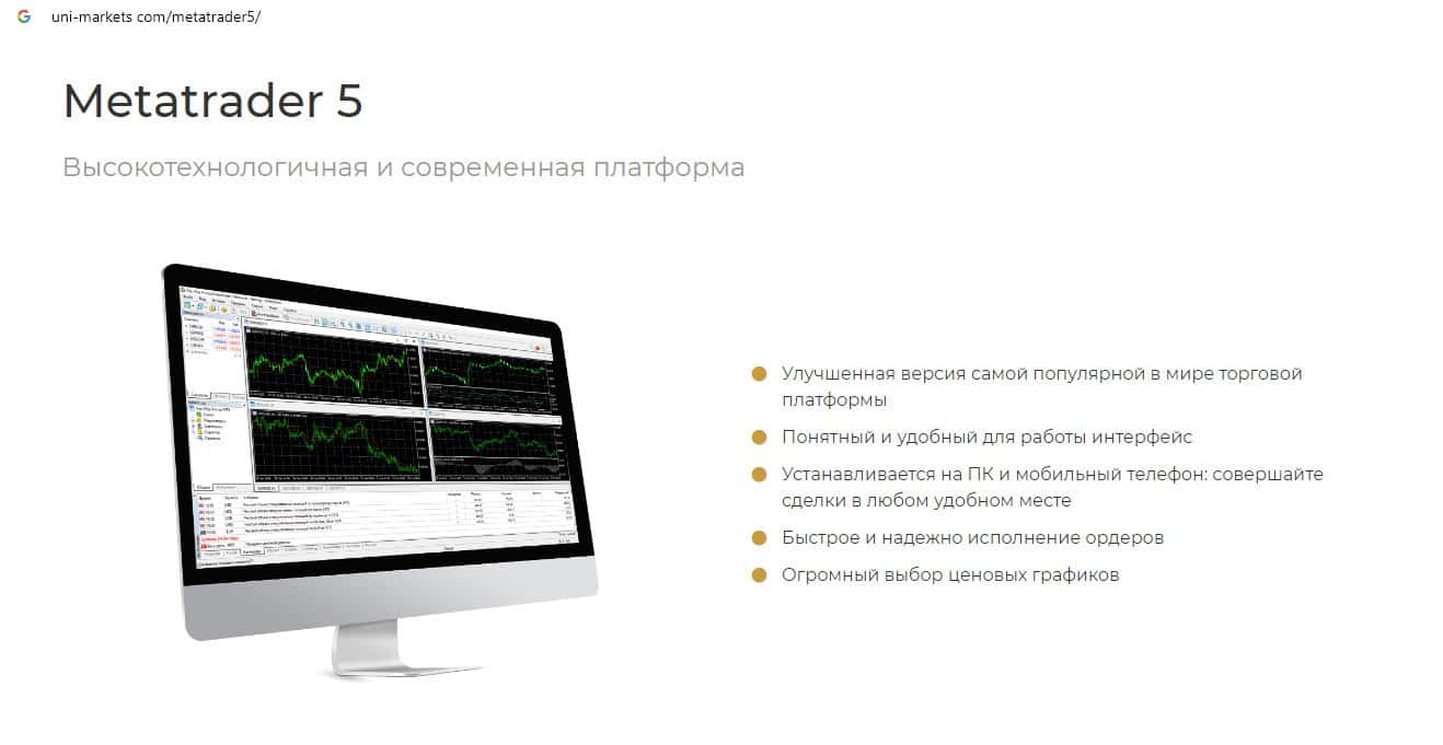 Жулики ЮНИ Маркетс предлагают торговать с помощью торговой платформы Мета Трейдер 5, которая разработана мошенниками MetaQuotes для слива денежных средств клиента.
