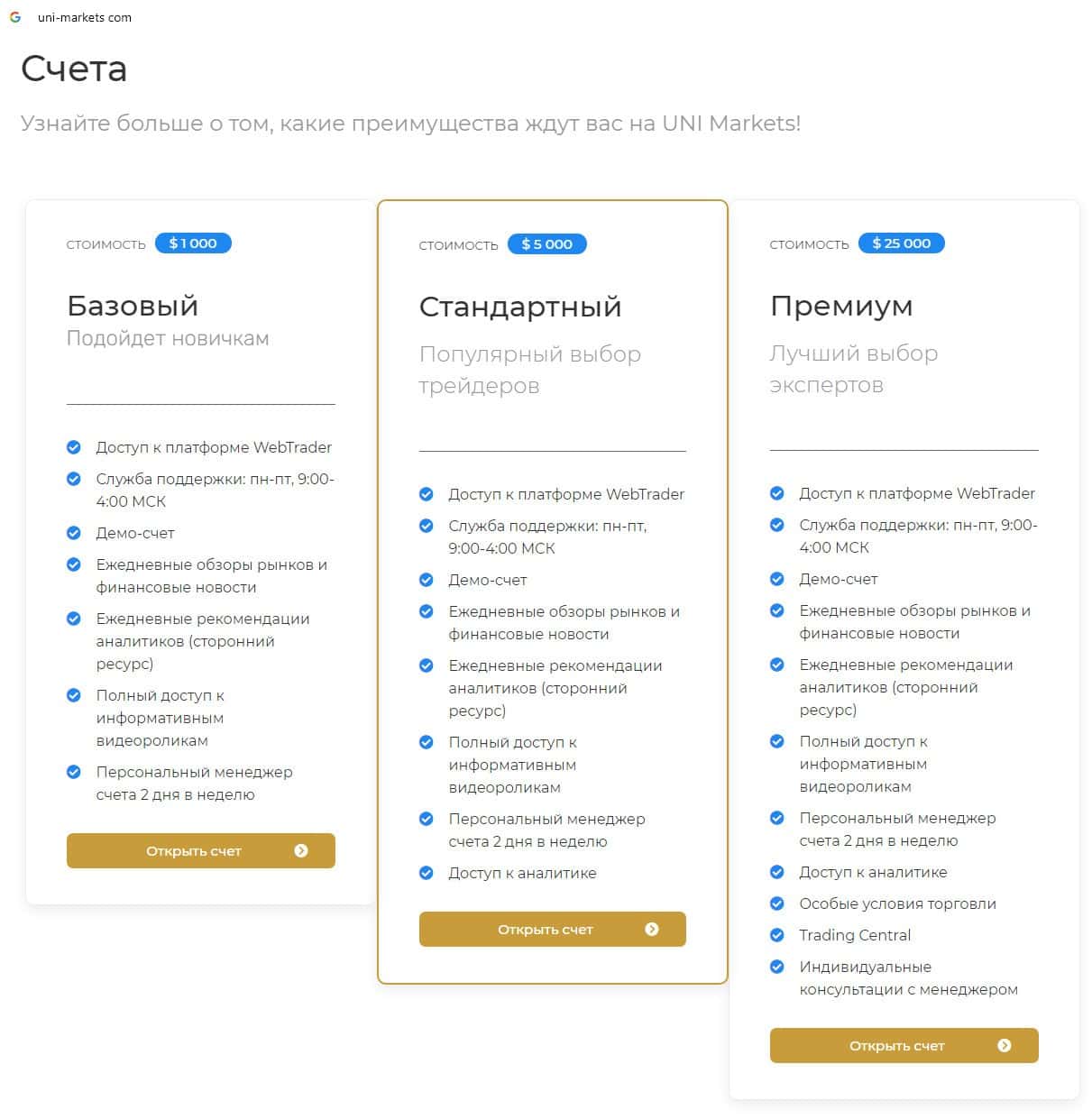 Аферисты UNI Markets предлагают клиентам на выбор 3 типа торгового счета: Базовый, Стандартный и Премиум. Реальный Форекс стартует в основном с суммы в 100000 долларов.