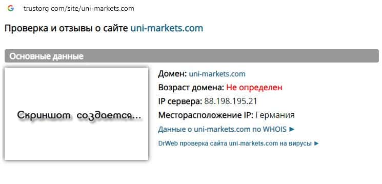 Проверка интернет-ресурса шулеров ЮНИ Маркетс на trustorg com показала, что возраст домена определить невозможно, мы имеем дело с очередной мошеннической организацией.